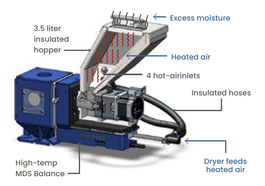 - Material near the dosing cylinder/auger is also dried, minimizing the risk of moisture reabsorption.